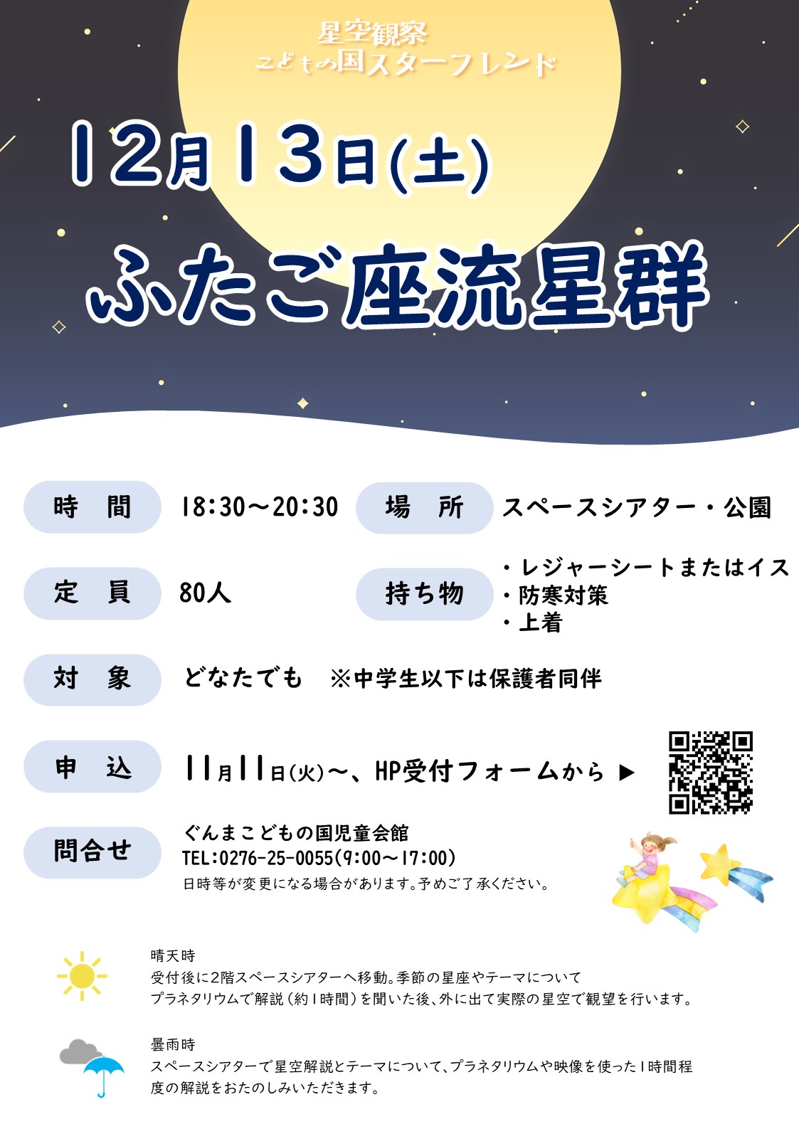 12月13日(土)星空観察 こどもの国スターフレンド -ふたご座流星群- -