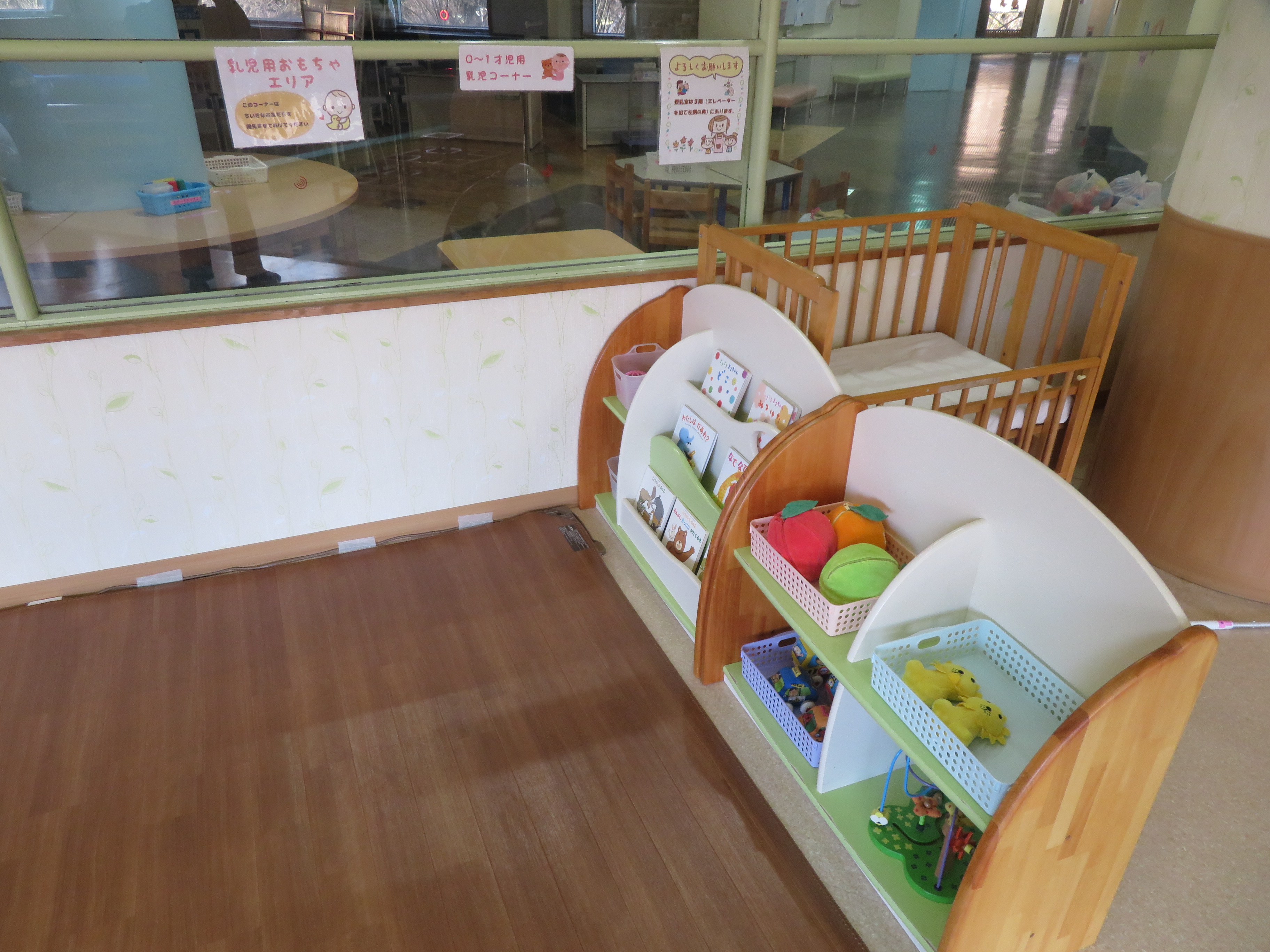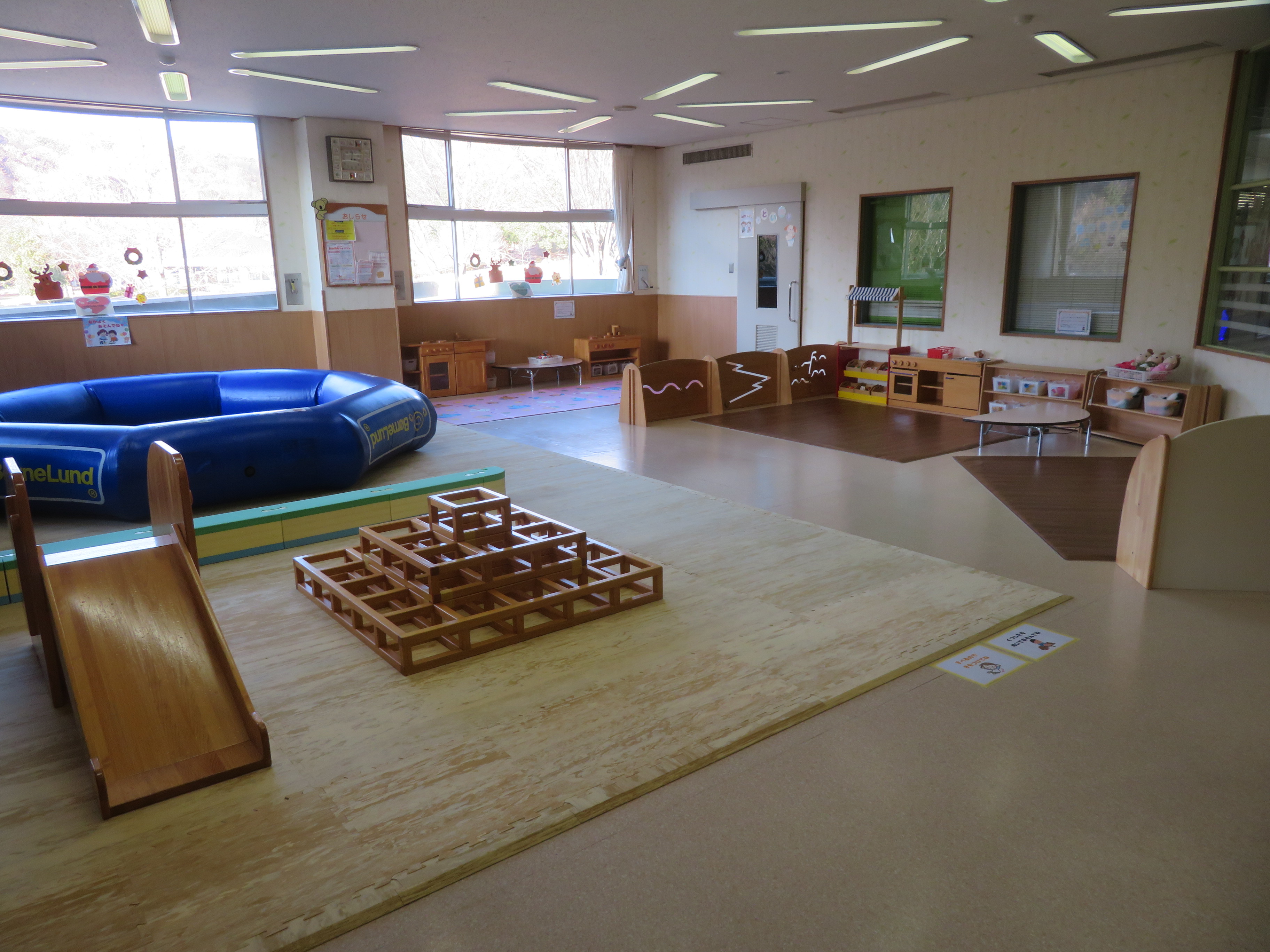 プレイルームでは、群馬県の木でつくられた県産材遊具をはじめ、乳児向けのコーナーやおままごとなどをご用意しております。ぜひご利用ください。